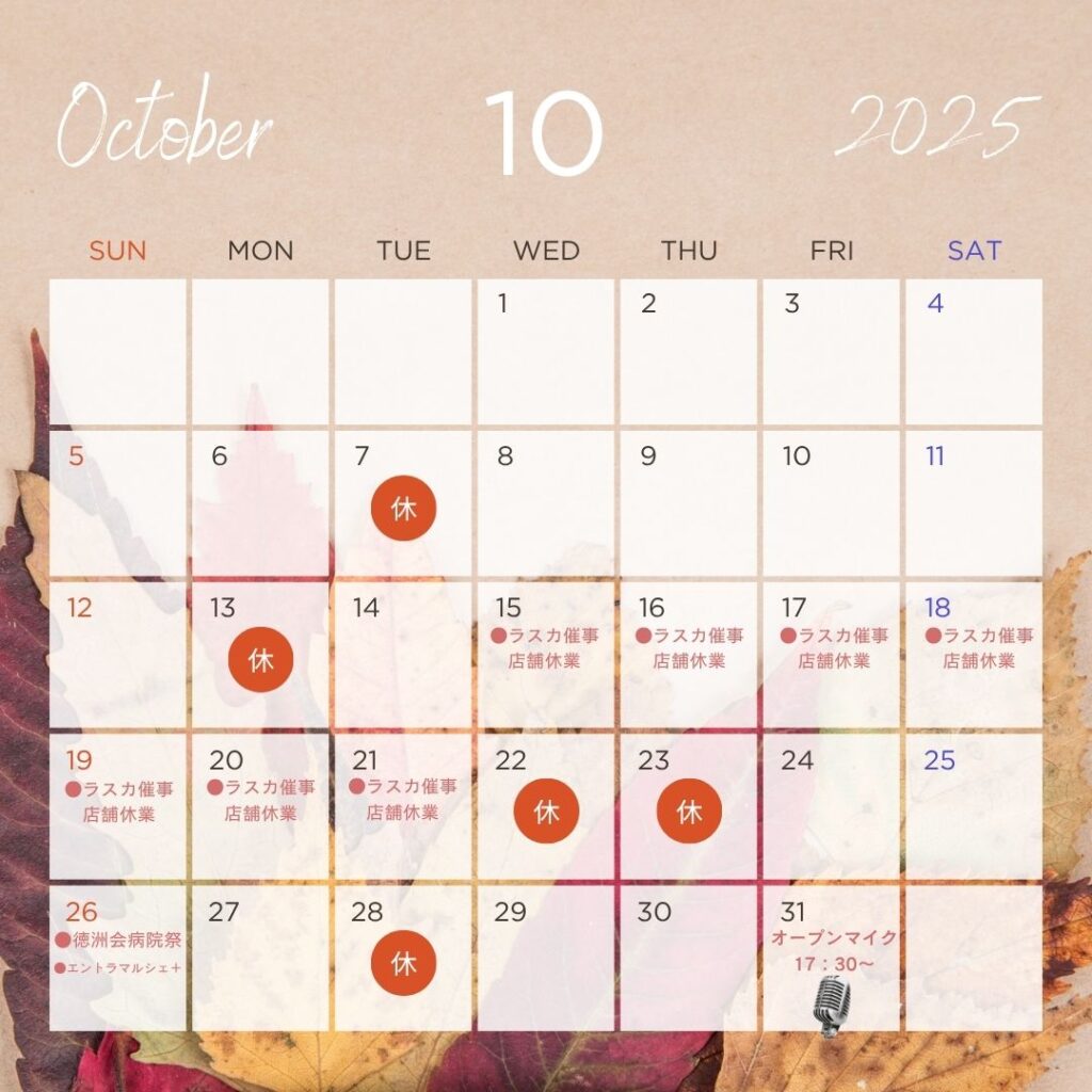10月はイベント出店が多く、店舗営業がお休みの日もあります。ご来店の際はスケジュールをご確認くださいね。